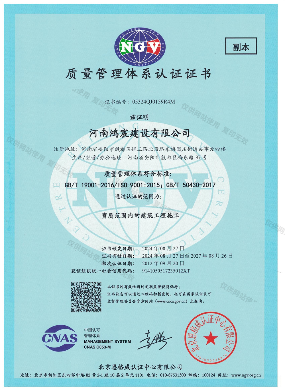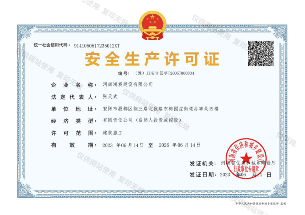 公司遵循“鴻圖展志、宸宇興邦”的企業(yè)精神,秉承“質(zhì)量占市場(chǎng),管理求效益,誠(chéng)信謀發(fā)展”的發(fā)展理念,堅(jiān)持“主業(yè)做強(qiáng),專業(yè)做精,用戶滿意,服務(wù)社會(huì)”的發(fā)展思路,堅(jiān)守“安全第一、預(yù)防為主、綜合治理”的安全生產(chǎn)方針,落實(shí)“全員、全過程、全方位、全天候”的“四全”動(dòng)態(tài)安全管理制度,實(shí)施全員目標(biāo)責(zé)任管理,貫徹以事前預(yù)控、過程控制、檢驗(yàn)控制相結(jié)合的全方位、全過程、多層次的質(zhì)量管理體系,嚴(yán)格按照國(guó)家施工規(guī)范和公司一體化管理手冊(cè)進(jìn)行施工。